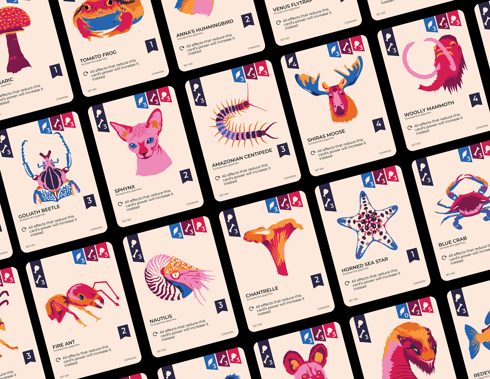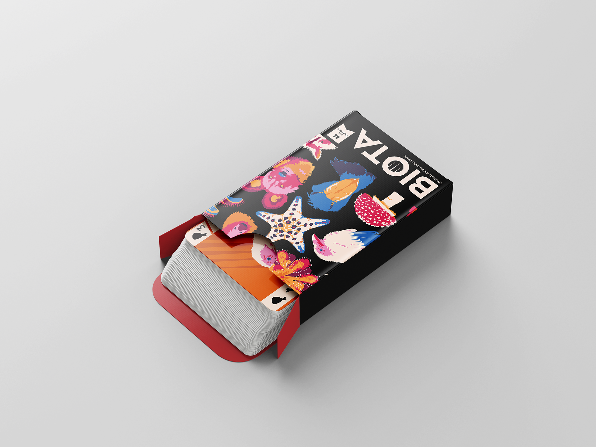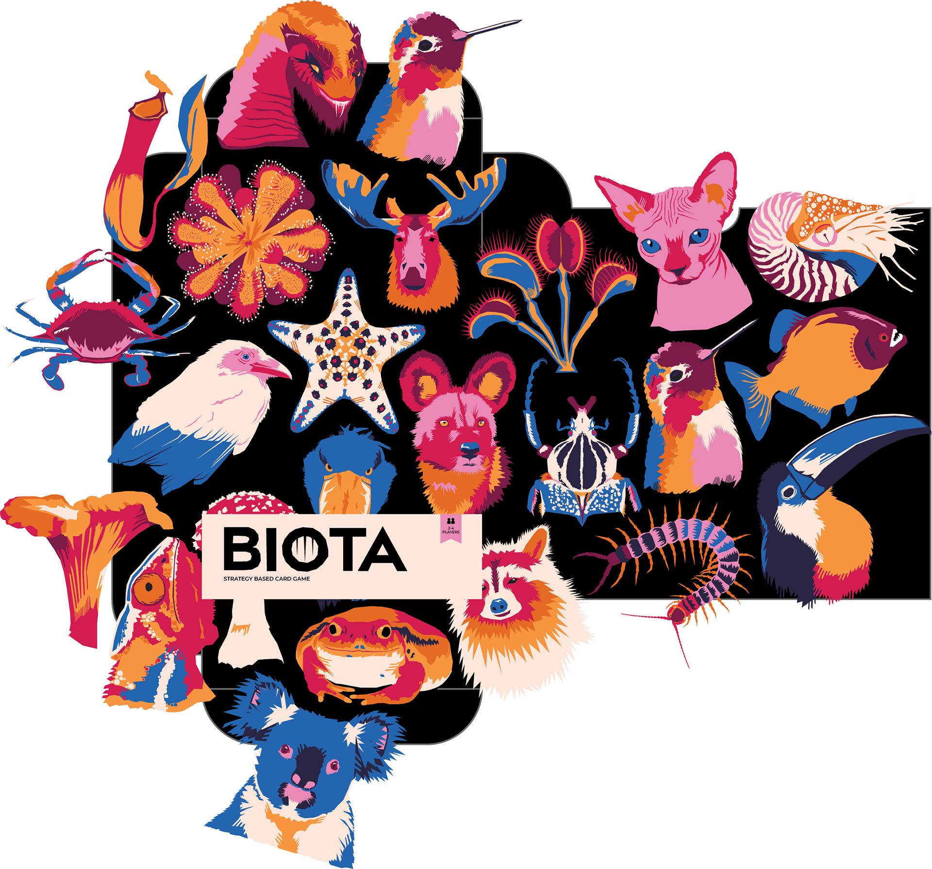 BIOTA is a two player strategy based card game. Players build their deck with cards, each representing an animal with a unique ability. Players win by conquering "habitats," unique environments with varying effects.