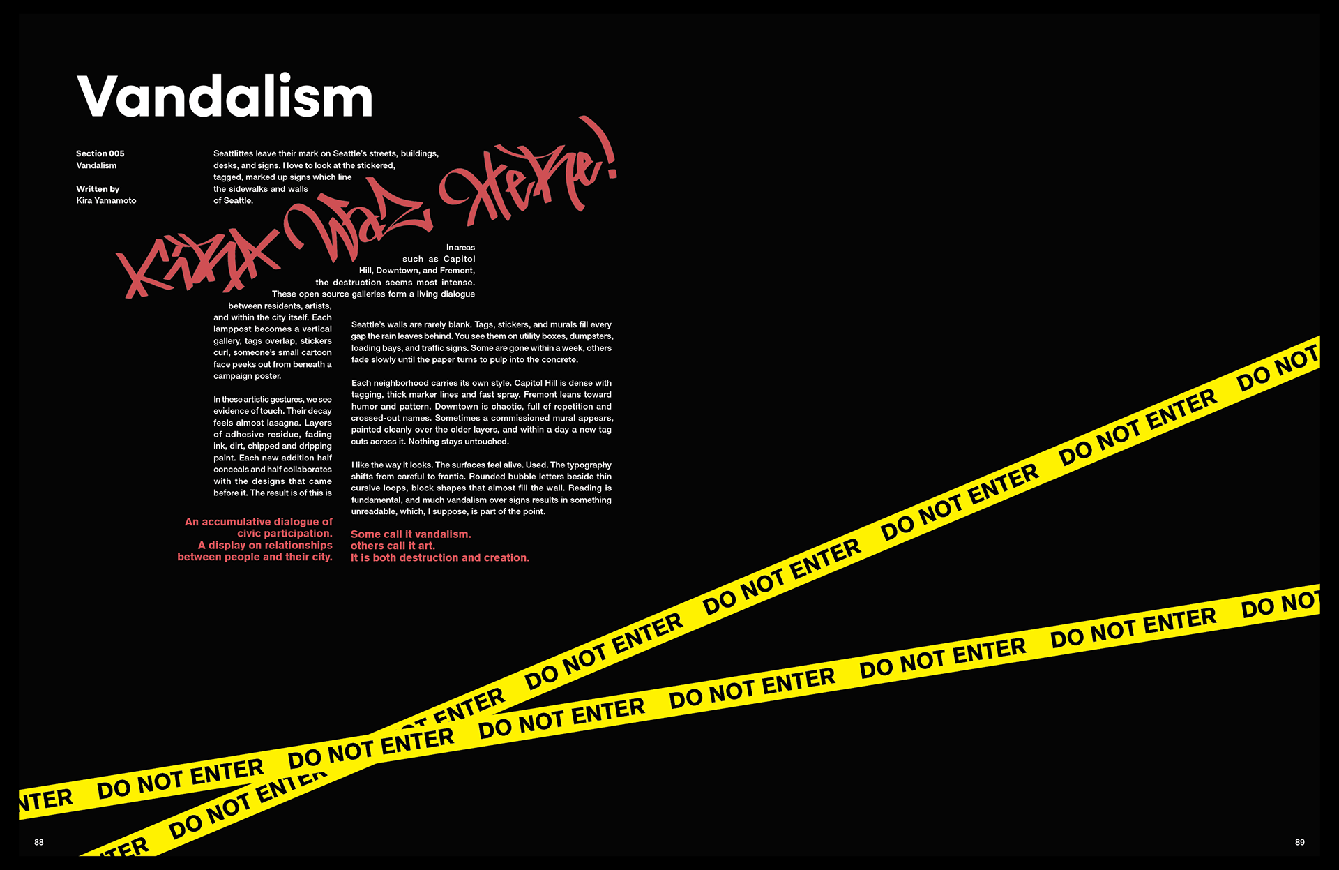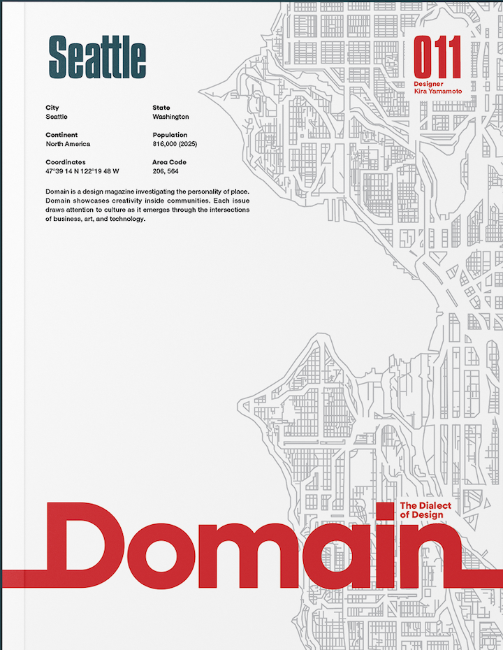 Domain Magazine is a 138-page project born from my love of and experiences in my hometown city of Seattle, Washington. Domain showcases the creativity inside particular communities. Each issue draws attention to its culture as it emerges through the intersections of business, art, and technology, tracing how they influence the broader visual landscape. It exists to provide insight into a broad Seattle experience in a way that still feels intimate and local, but casual enough to flip through lightly. Its a great coffee table book.