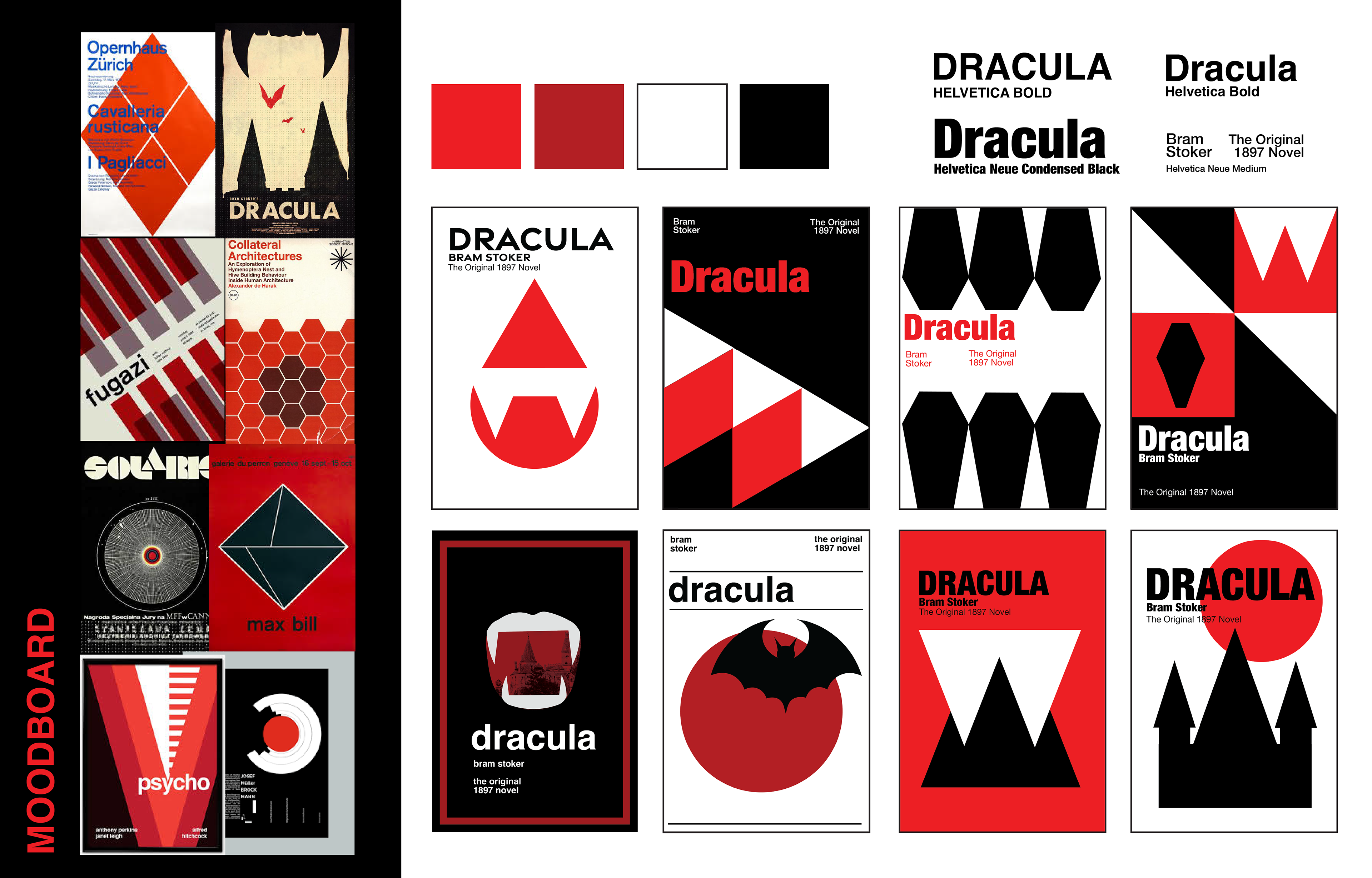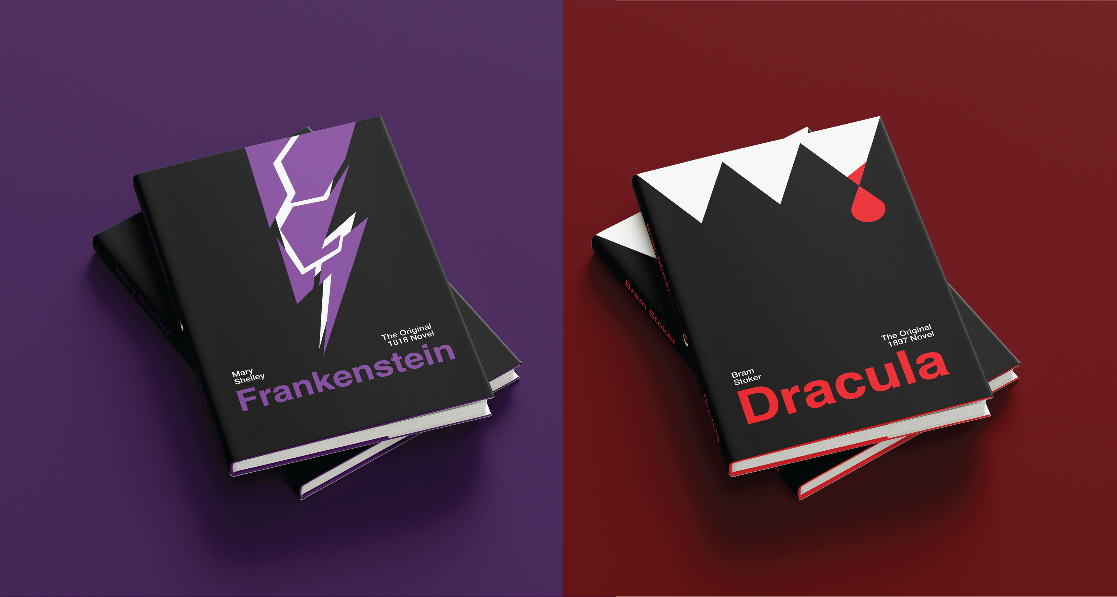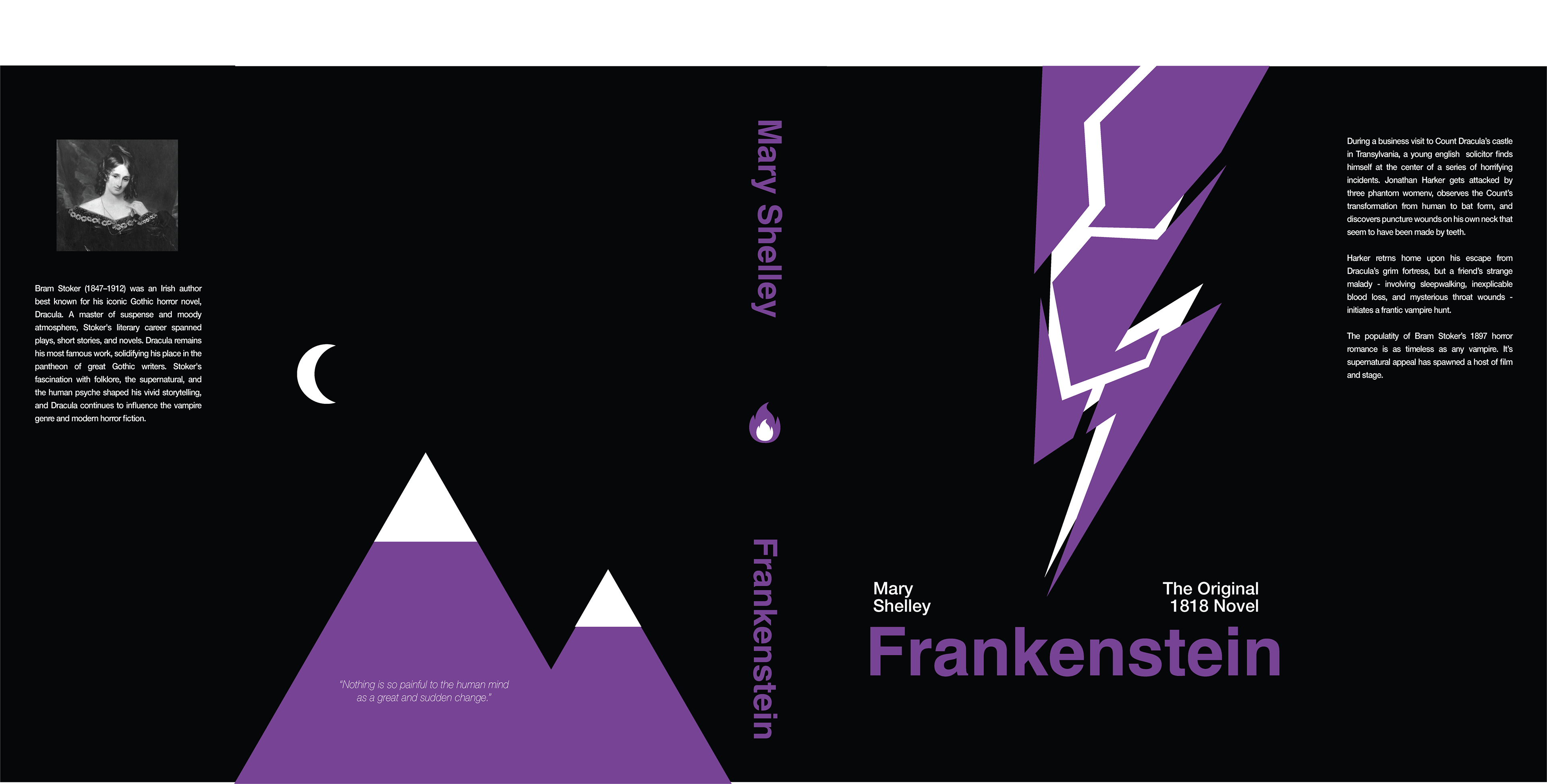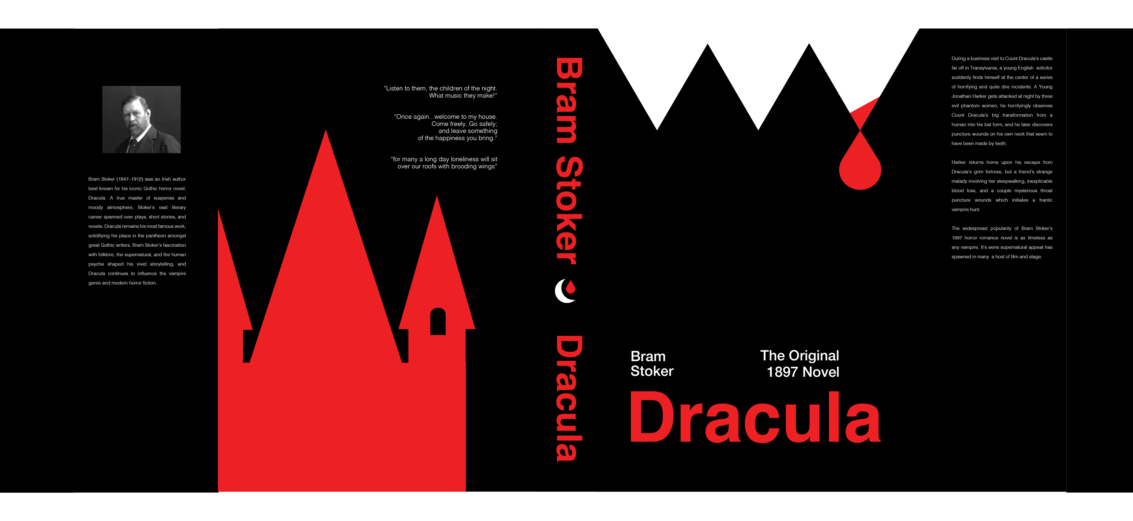 The goal was to create a modernist style book sleeves, while maintaining elements of gothic horror and staying thematic to the books. I chose to implement a sans serif typeface, using the Helvetica type family. This maintains the novel's bold and impactful tone. I used simple color palettes either one accent color. The white elements stand out, adding tension, and leading the eye down towards the title. Additionally, I placed elements on the back, geometric nods to the story.
