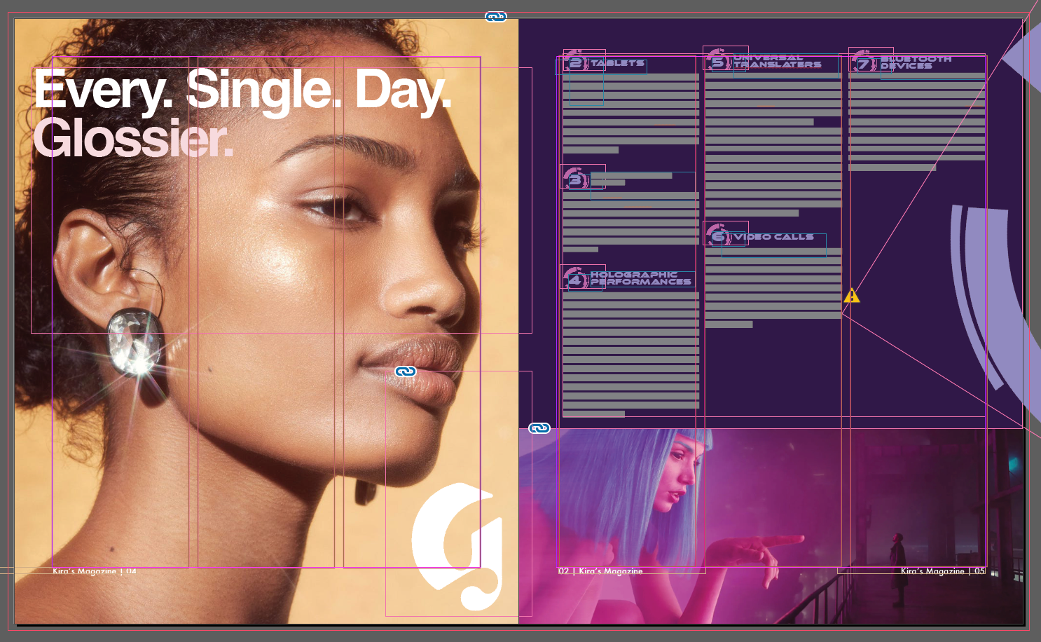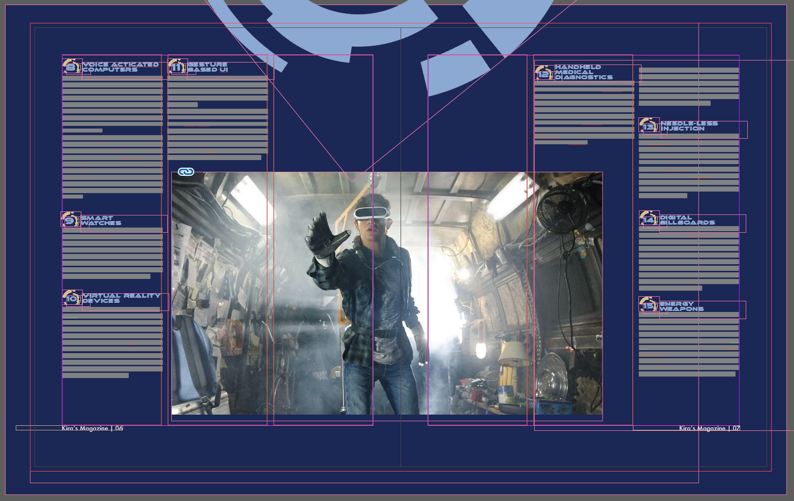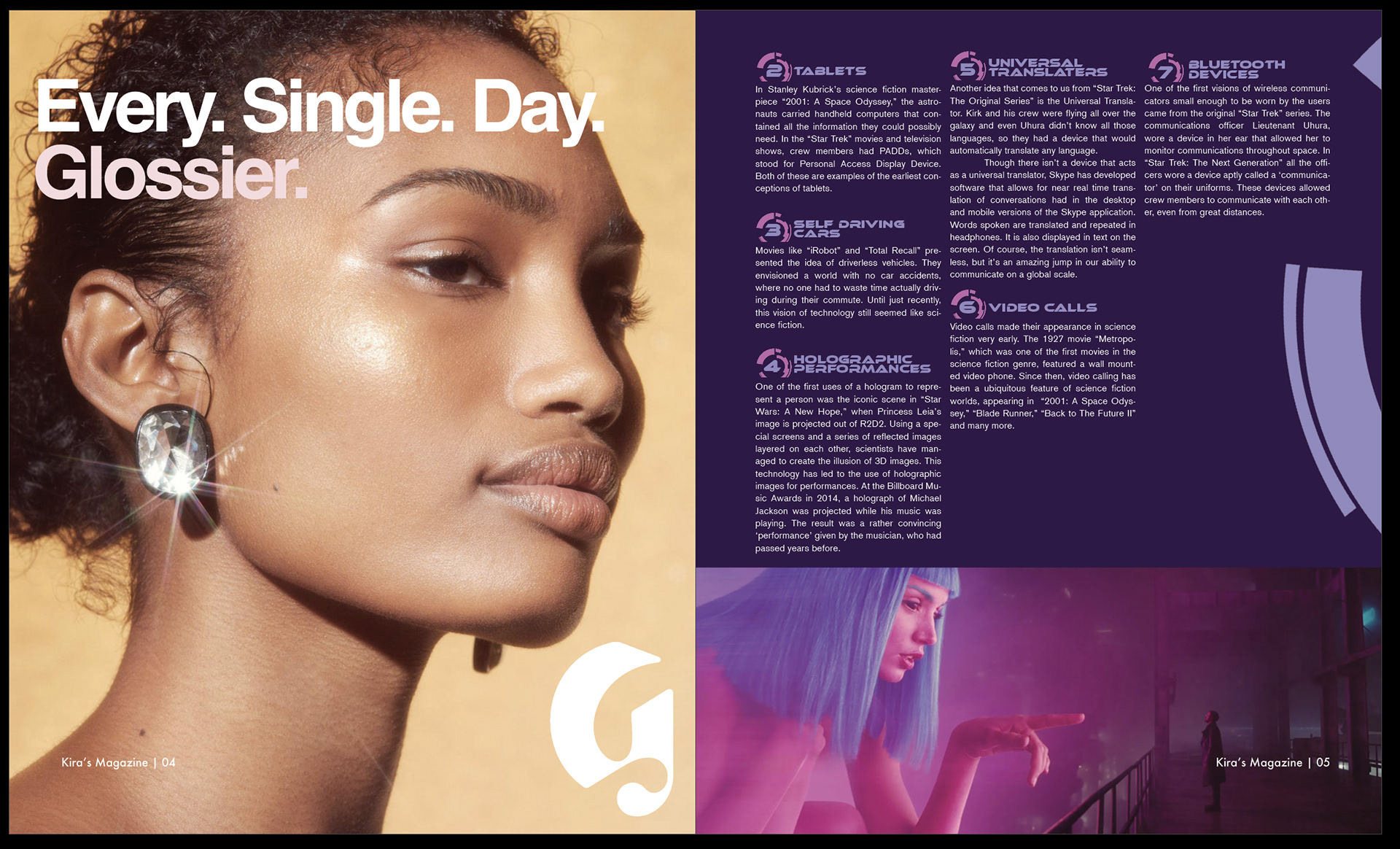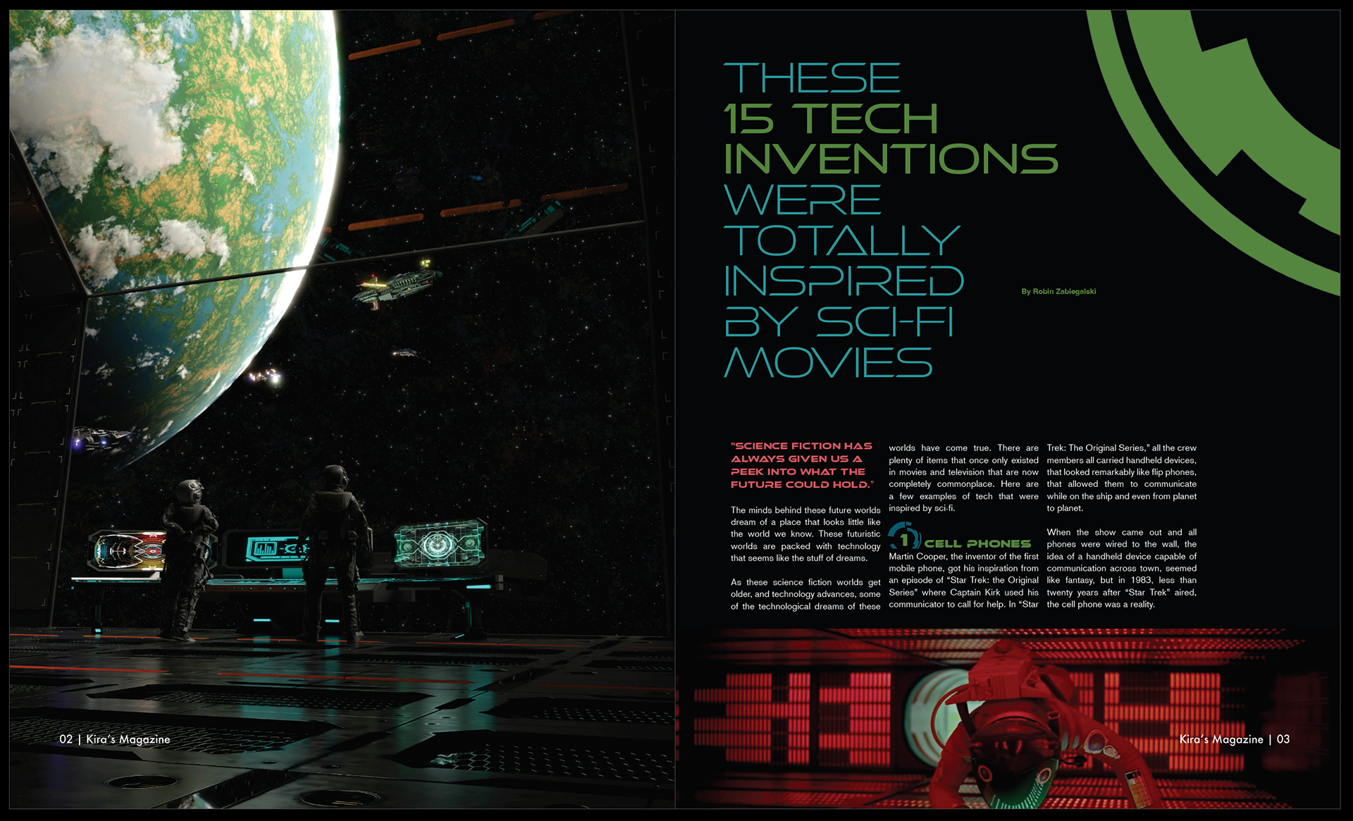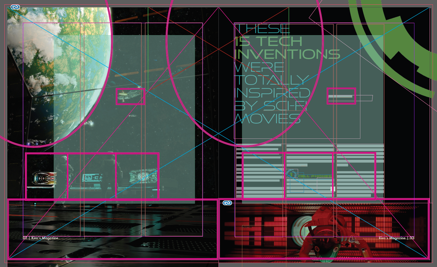 The goal was to create a Sci-Fi magazine that paired well with photography. I mirrored many of the photographs in the text and graphics, keeping the aesthetic and mood the same on each spread. I chose a geometric sans serif type and incorporated a geometric graphic into each spread.